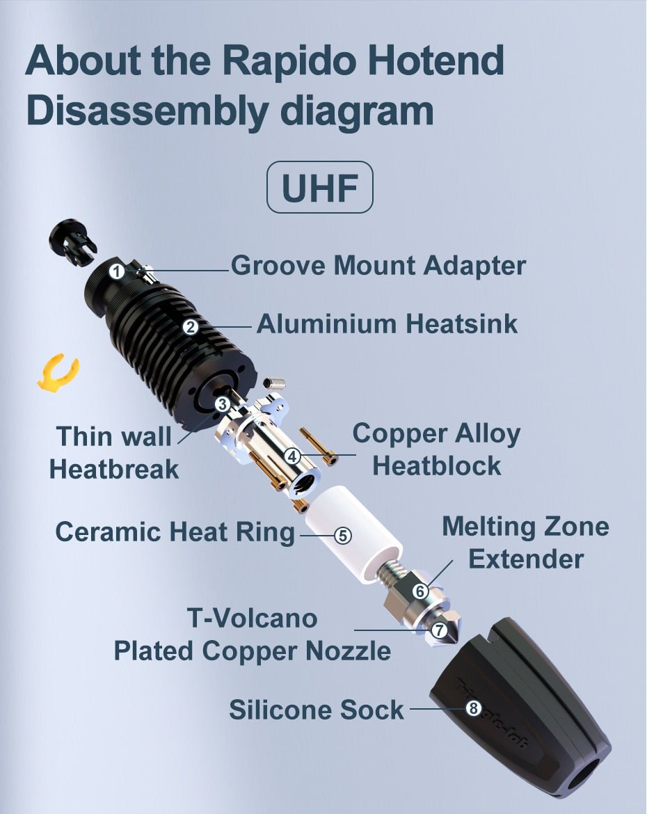 Rapido hotend has a unque copper alloy cylindrical melting zone wrapped in a high-powered ceramic heating element so that it has a more uniform heating section and a shorter heat transfer path. Therefore, greater flow and heating efficiency can be achieved.